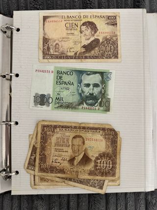 Conjunto de billetes antiguos españoles. De algunos billetes hay varios - Billetes del Banco de España. - Diversas denominaciones: 1, 5, 10, 25,50 y 100 pesetas. - Diseños variados con retratos y escenas históricas. Se escuchan ofertas