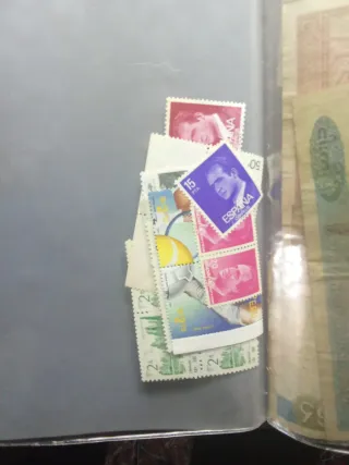 Muestras Numismáticas y monedas y billetes extranjeros y sellos de España y extranjero.