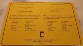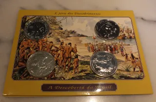 La serie X de monedas conmemorativas de los Descubrimientos Portugueses, emitida por Portugal en 1999, conmemora el Descubrimiento de Brasil por Pedro Álvares Cabral. Esta serie consta de 4 monedas de 200 escudos de plata (proof, 925/1000) de 36 mm, destacando a figuras como Pedro Álvares Cabral y Bartolomeu Dias (Morte no Mar). Detalles de la Serie X (1999) - Descubrimiento de Brasil Emisor: Portugal. Año: 1999. Serie: X (Descobrimentos Portugueses). Valor: 200 Escudos. Metal: Plata (.925). Peso: 26.5 gramos plata .925 (24.5 gramos plata .999). Total plata 98 gramos .999 (3.15 onzas troy) Diámetro: 36 mm.