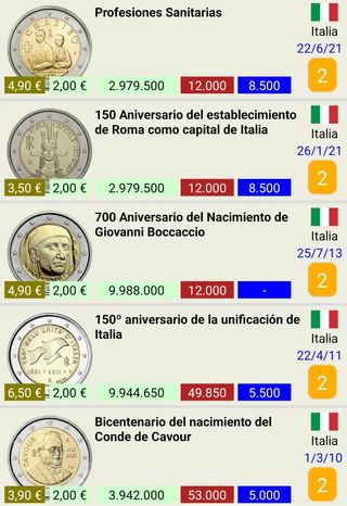 Monedas de 2€ Italianas, de diferentes modelos y años. NO realizo CAMBIOS ((sólo venta)) Disponibilidad de monedas circuladas y sin circular. PRECIO según modelo, país y año. Se agrupan pedidos con el resto de anuncios que tengo en wallapop.