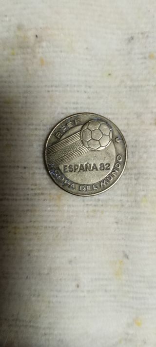 Moneda conmemorativa de la RFEF del Mundial de España 82. - Diseño con balón de fútbol. - Inscripción ESPAÑA 82 COPA DEL MUNDO. Precio 3 euros.