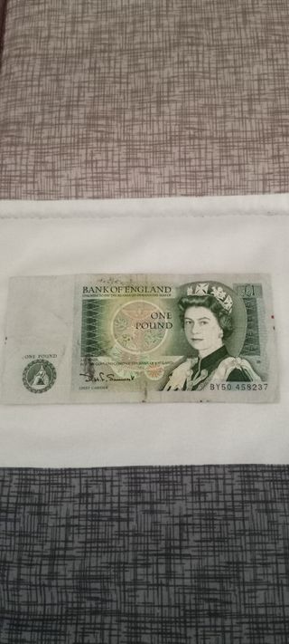 Billete de una libra del Banco de Inglaterra con la imagen de la Reina Isabel II. - Denominación: Una Libra. - Emisor: Bank of England. - Serie: BY50 458237. Precio 3 euros.