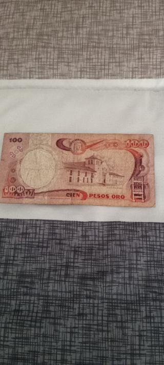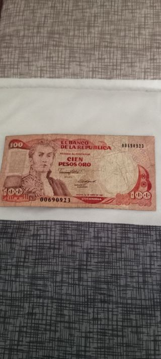 Billete de 100 Pesos Oro de Colombia, emitido por el Banco de la República. - Denominación: Cien Pesos Oro. - Serie: 00690923. - Lugar de emisión: Bogotá. - Fecha de emisión: 15 de enero de 1987.