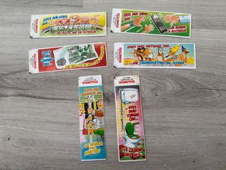 Conjunto de 6 tiras adhesivas de Donettes con diferentes diseños. - Eres más hábil que... un pulpo con un futbolín - Eres más sobao que... un mando a distancia - Eres más chungo que... un billete de mil tres - Eres más antiguo que... un cronómetro de arena - Eres más agarrado que... la barra del metro - Eres más tirado que... la cadena del W.C. - Gastos de envío de 5 euros por mensajería. - Las fotos son la descripción. - Palabras clave: Donettes, Donuts, Bimbocao, Bimbo, Bollycao, Panrico, Phoskitos, Cropan