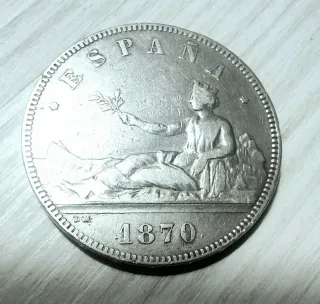 Moneda de 5 pesetas del año 1870. - Diseño con figura alegórica. - Inscripción ESPAÑA en la parte superior. - Año 1870 en la parte inferior. Es auténtica.Plus ultra en las columnas de Hercules. Cantos con inscripción soberanía nacional y 5 estrellas