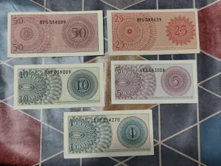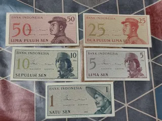 Conjunto de cinco billetes de Rupias de Indonesia del año 1964. - Billetes de 50, 25, 10, 5 y 1 Sen. - Diseño con retratos y motivos nacionales. Se venden juntos o separados