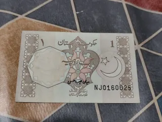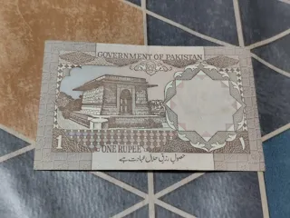 Billete de 1 rupia de Pakistán. Presenta un diseño con la luna creciente y la estrella, símbolos nacionales. - Denominación: 1 Rupia - País: Pakistán - Diseño: Luna creciente y estrella