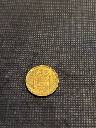 Moneda de una peseta de la época de Franco. Presenta daños visibles. - Diseño con escudo. - Inscripción 'ESPAÑA'.