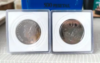 Se venden pruebas de anverso y reverso de la moneda de 500 pesetas del año 1987. Acero inoxidable. 12 gramos de peso cada una. 28 mm de diámetro. Encapsuladas. En estado FLOR DE CUÑO. - Prueba de anverso con los retratos de Juan Carlos y Sofía. - Prueba de reverso con el valor 500 PESETAS y el escudo.