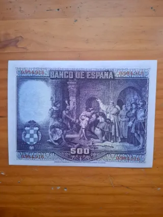 Billete de 500 pesetas del Banco de España con fecha de 15 de agosto de 1928. Presenta un retrato del Cardenal Cisneros y una vista de un edificio emblemático. EBC+ - Serie: 0.984.916 - Lugar de emisión: Madrid - Impreso por Bradbury, Wilkinson y Cía.