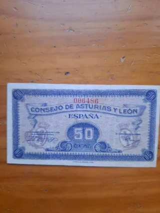 Billete de 50 céntimos del Consejo de Asturias y León, España. EBC- - Número de serie: 006486. - Diseño con escudos y texto en azul.