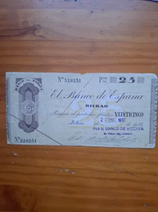 Billete de 25 pesetas del Banco de España, emitido en 1937. MBC- - Número de serie: 529251 - Fecha: 27 de enero de 1937 - Emitido por el Banco de Vizcaya - Valor: Veinticinco pesetas