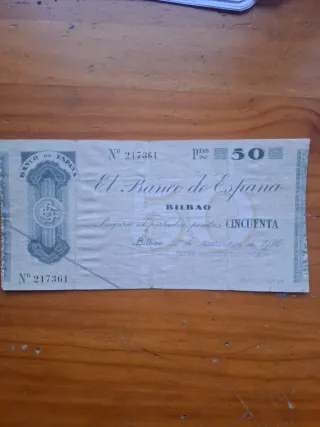 Billete de 50 pesetas del Banco de España, emitido en Bilbao en septiembre de 1936. MBC - Número de serie: 217361. - Fecha de emisión: 1936. - Banco emisor: Banco de España. - Lugar de emisión: Bilbao.