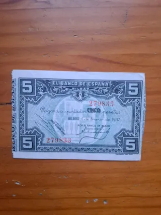 Billete de 5 pesetas emitido por el Banco de España en Bilbao. MBC+ - Fecha: 1 de enero de 1937. - Serie: 279833. - Valor: Cinco pesetas.