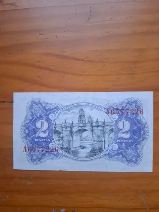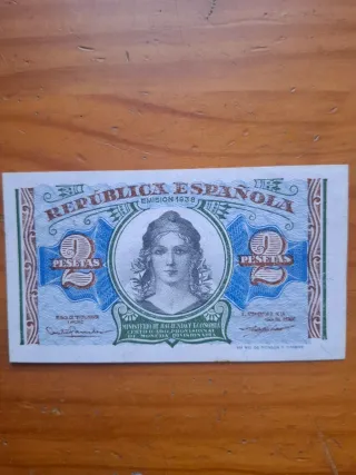 Billete de 2 pesetas de la República Española, emitido en 1938. SC - Emisión provisional de moneda divisionaria. - Diseño con retrato central y escudos. - Texto: República Española, Emisión 1938, 2 Pesetas, Ministerio de Hacienda y Economía. - Firmas de interventor y director.