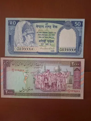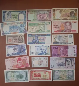 18 billetes SIN CIRCULAR - Nepal: 50 rupias - Irán: 2000 riales - Siria: 50 y 100 libras - Jordania: 1 dinar - Tailandia: 100 Baht - Japón: 50 sen - Myanmar: 100 Kyats - Singapur: 1 dolar - Malasia: 1 ringgit - Kazajistán: 1 tenge - Indonesia: 1000 rupias - Pakistán: 1 y 100 rupias - Arabia Saudí: 5 riyales - Camboya: 1,5 y 10 rieles
