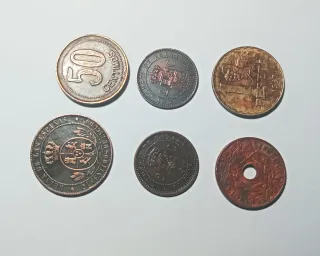 Conjunto de cinco monedas antiguas de colección. Cada moneda tiene un diseño único. - Monedas de diferentes valores. - Materiales variados. - Ideal para coleccionistas. Precio negociable