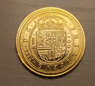 100 escudos 1623 Segovia El centén es, seguramente, la más importante moneda de oro del mundo occidental. Durante este reinado se acuñó en 1623, 1631, 1633, 1638 y 1659. Su peso teórico era de 359,19 gramos y era utilizada para obsequiar a personalidades. La que aqui se reproduce, cuyo original se encuentra en el Museo de la FNMT, se acuñó el 15 de septiembre de 1623, durante la visita que el principe de Gales realizó al Real Ingenio de Segovia. Moneda perteneciente a la colección que salió en el periódico el pais, elimitada y exclusiva acuñada por la fábrica nacional de moneda y timbre.Con baño de oro puro. Numismática