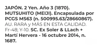 Moneda de 2 yenes de Japón. Año 3 ( 1870) Descripción en la 2 Foto Encapsulada PCGS Ms63 !!! PIEZA RARA EN CALIDAD SC!! Procede de subastas Española. - Diseño de dragón en el anverso. - Motivos florales y emblema imperial en el reverso.