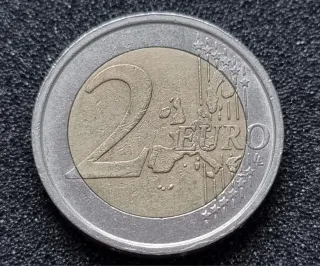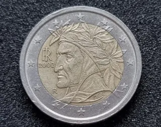 Moneda de 2 euros conmemorativa de Italia del año 2002. - Diseño de Dante Alighieri. - Borde con estrellas y el año. - Grabado MCC en la parte inferior.