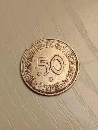 País: Alemania - República Federal Denominación: 50 Pfennig Año: 1975 El anverso muestra a una joven descalza arrodillada plantando un pequeño roble. El roble fue un símbolo alemán durante siglos. Esta escena representa la esperanza de reconstrucción de Alemania tras la guerra. La letra "D" visible debajo del valor "50" indica que fue acuñada en la Casa de la Moneda de Múnich (Munich Mint). Moneda usada Numismática