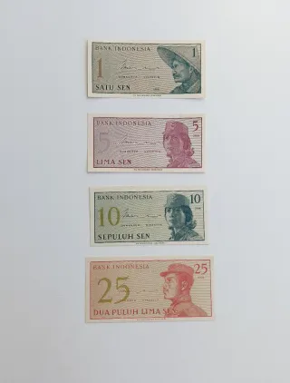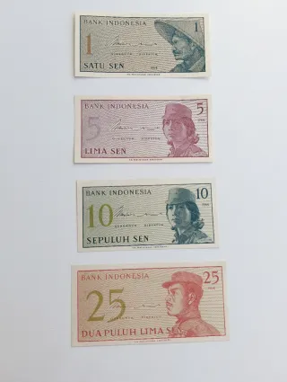 billetes de sen indonesios de 1964. Son billetes de 1, 5, 10 y 25 sen. Fueron emitidos por el Bank Indonesia en 1964. Presentan retratos de figuras históricas o culturales indonesias. Actualmente son artículos de colección y no moneda de curso legal.