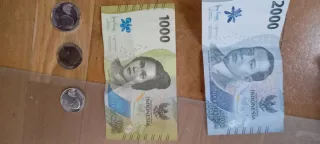 Conjunto de billetes y monedas de Indonesia. - Un billete de 1000 rupias. - Un billete de 2000 rupias. - Tres monedas.