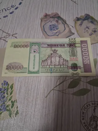 Billete de 20000 Tugrik de Mongolia. - Año de emisión: 2013. - Diseño con el edificio del Banco de Mongolia y el paisaje de la estepa.