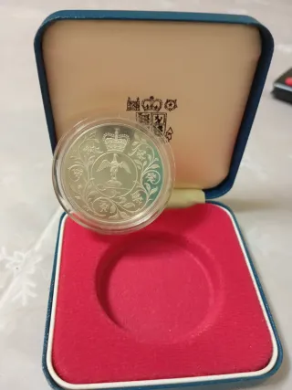 Moneda de plata conmemorativa de Isabel II del año 1977, presentada en su estuche original. - Diseño de Isabel II a caballo. - Año: 1977 - Material: Plata. - Incluye estuche de presentación.
