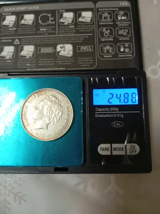 Moneda de plata conmemorativa del año 1896. - Diseño detallado con perfil. - Inscripción POR LA GRACIA DE DIOS ALFONSO XIII Y DOS - Peso aproximado: 24.88g