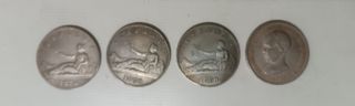 Conjunto de 4 monedas de 4 duros, réplicas de época. - Diseño clásico con figura alegórica. - Inscripción ESPAÑA y año 1870 en algunas piezas. - Borde con detalles. - Una moneda presenta perfil de personaje histórico.