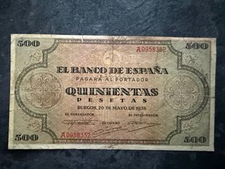 Billete de 500 pesetas del Banco de España, emitido en Burgos el 20 de mayo de 1938. - Denominación: Quinientas Pesetas. - Serie: A0958352. - Fecha de emisión: 20 de mayo de 1938. - Lugar de emisión: Burgos.