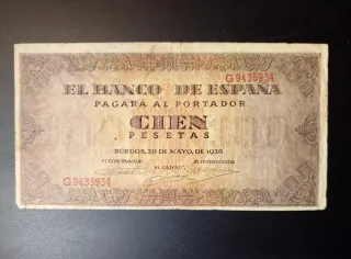 Billete de 100 pesetas del Banco de España, emitido en Burgos en 1938. - Serie G. - Número de serie: G9435934. - Fecha de emisión: 20 de mayo de 1938.