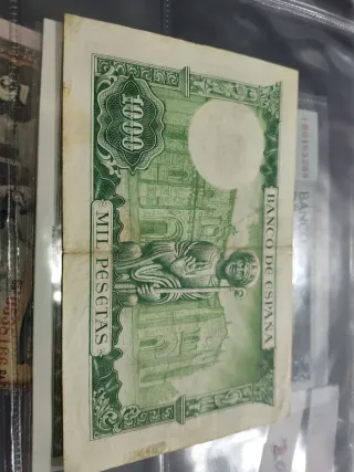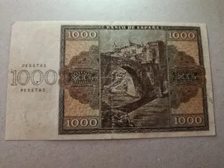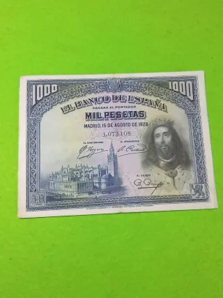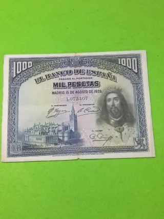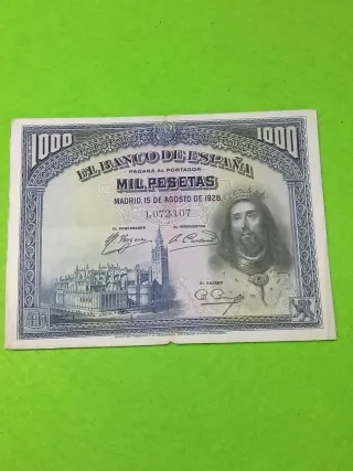 Billete de 1000 pesetas del Banco de España, emitido en Madrid el 15 de agosto de 1928. Usado. - Diseño detallado con edificios históricos y retrato. - Número de serie: 1.160.835. - Firmas de El Gobernador, El Interventor y El Cajero.