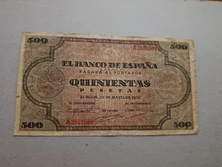 Billete de 500 pesetas del Banco de España, emitido en Burgos el 20 de mayo de 1938. - Valor: Quinientas Pesetas. - Fecha de emisión: 20 de mayo de 1938. - Lugar de emisión: Burgos. - Serie: A3507599. - Más billetes en mi perfil.