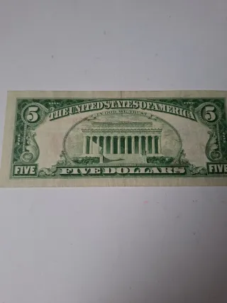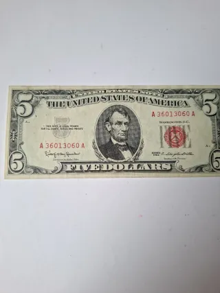 Antiguo billete de cinco dólares de los Estados Unidos de América, serie 1963 con SELLO ROJO del Tesoro Norteamericano. Muy dificil. Se encuentra en un extraordinario estado de conservación. - Retrato de Abraham Lincoln. - Serie 1963. - Washington D.C.