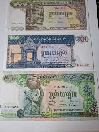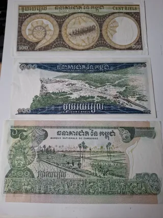 Conjunto de tres billetes Camboyanos antiguos de tamaño grande en una extraordinaria calidad. - Un billete de 100 rieles con la imagen de un templo. - Otro billete de 100 rieles con la imagen de un templo. - Un billete de 500 rieles con la imagen de una mujer portando una vasija.