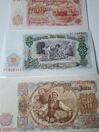 Billetes de Bulgaria 10, 25 y 50 Leva