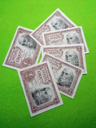Conjunto de 6 billetes de 1 peseta del Banco de España, emitidos en 1953. En excelente estado - Diseño con retrato de personaje histórico. - Texto: Banco de España, Una Peseta, Madrid 22 de Julio de 1953. - Billetes de curso legal en su momento.