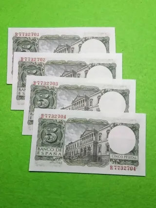 Conjunto de cuatro billetes de 5 pesetas de España. Correlativos. En excelente estado - Serie R7732701 - Serie R7732702 - Serie R7732703 - Serie R7732704