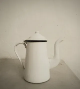Cafetera antigua de metal esmaltada blanca.
