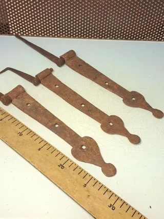 Conjunto de tres bisagras antiguas, elaboradas en hierro forjado. Presentan un diseño rústico y detalles decorativos. - Material: Hierro forjado. - Estilo: Rústico. - Acabado: Oxidado.