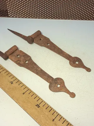 Conjunto de dos bisagras antiguas de 23cm, fabricadas en hierro forjado con un acabado rústico. - Diseño tradicional. - Puntas decorativas. - Aspecto envejecido por el paso del tiempo.