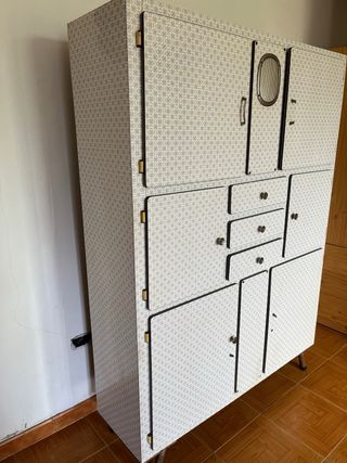 El chinero esta original, en excelentes condiciones del laminado, las bisagras y remates de goma de las puertas; hay tres tiradores que faltan. En el interior necesitaria pintura, asi como tambien en las patas. A recoger en Ortigueira, A Coruña.