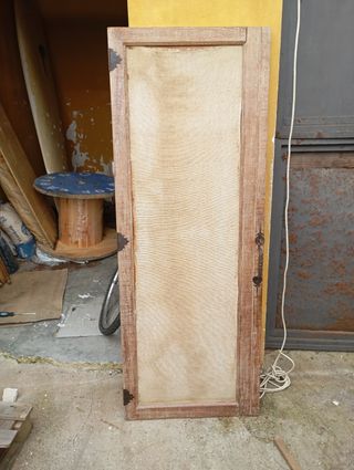 Antigua puerta de armario. X una parte está forrado de tela tipo saco. También tiene herrajes compuesto x Tirador y 3 bisagras. Para decoración interior exterior. Perchero. Jardín. Hogar. Medidas 64 ancho 1.72 alto.