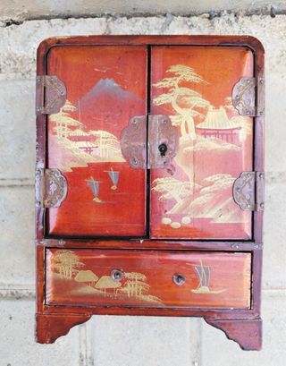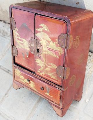 Pequeño Joyero Lacado Japonés con Forma de Armario - Lacado en rojo con detalles dorados en el exterior - 3 cajones lacados en negro en el interior - Faltan 2 Tiradores - No dispone de la llave - Algún arañazo exterior - Puede necesitar algún ajuste en bisagras - medida 20cm x 15,5cm x 8cm -