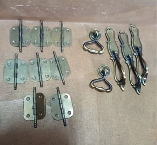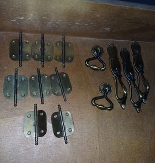 Juego de herrajes metálicos de color dorado. Ideales para restauración o proyectos de bricolaje. Medidas en fotos - Incluye 9 bisagras pequeñas y 4 tiradores. - Las bisagras son de estilo clásico. - Los tiradores tienen un diseño elegante y antiguo. TODO 9 EURS Vendo suelto Antiguo vintage retro colección museo Mil productos en mi perfil HAGO LOTES C60 C10