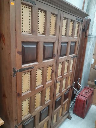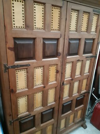 Precioso armario de madera, ideal para darle un toque rústico a tu hogar. Se encuentra en buen estado, aunque presenta algunas señales de uso que le dan carácter. POSIBILIDAD DE SERVIR GRATIS EN OURENSE CAPITAL - Diseño único con paneles de cuero sintético. - Bisagras metálicas de estilo antiguo. - Dos puertas