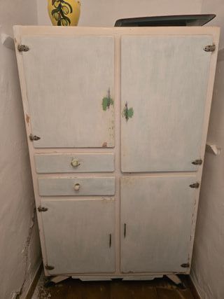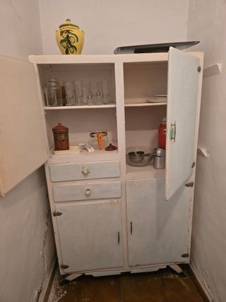 Urge por mudanza. Armario de cocina vintage con un diseño clásico. - Puertas superiores con bisagras. - Cajones con tiradores. - Puertas inferiores con tiradores. - Repintado en blanco. Pintura en mal estado