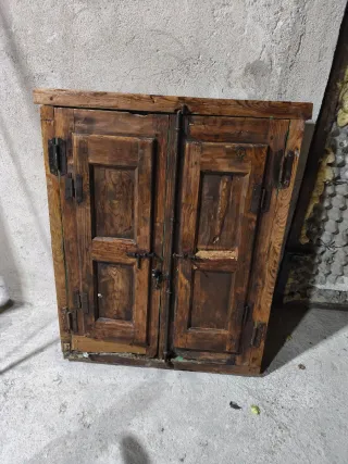 Precioso armario antiguo de madera maciza, ideal para darle un toque rústico a tu hogar. Se encuentra en buen estado de conservación. La última foto es de archivo, el armario está genial - Dos puertas con detalles tallados. - Bisagras de metal. - Diseño clásico y elegante.